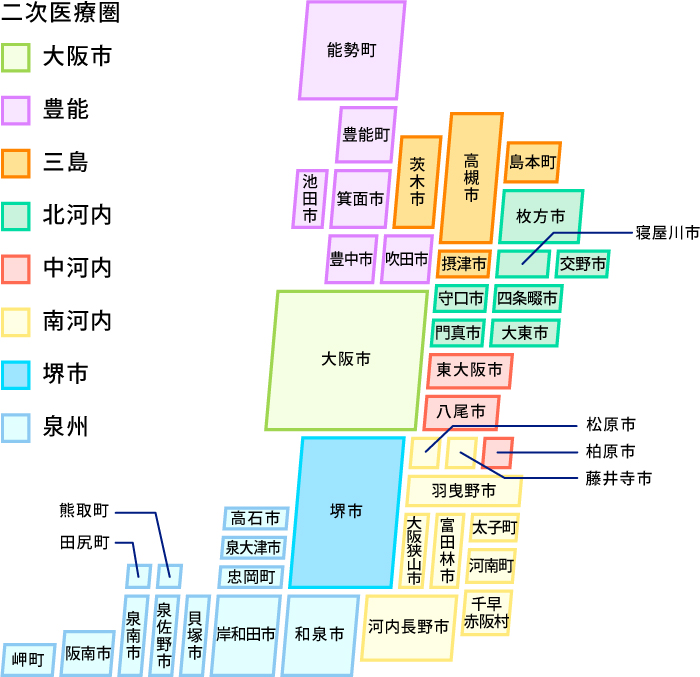 ● 第6次計画で設定した大阪府の8つの二次医療圏はすべて20万人以上の人口から構成されているため、第7次計画においても、引き続き同じ地域単位を、二次医療圏として設定します。